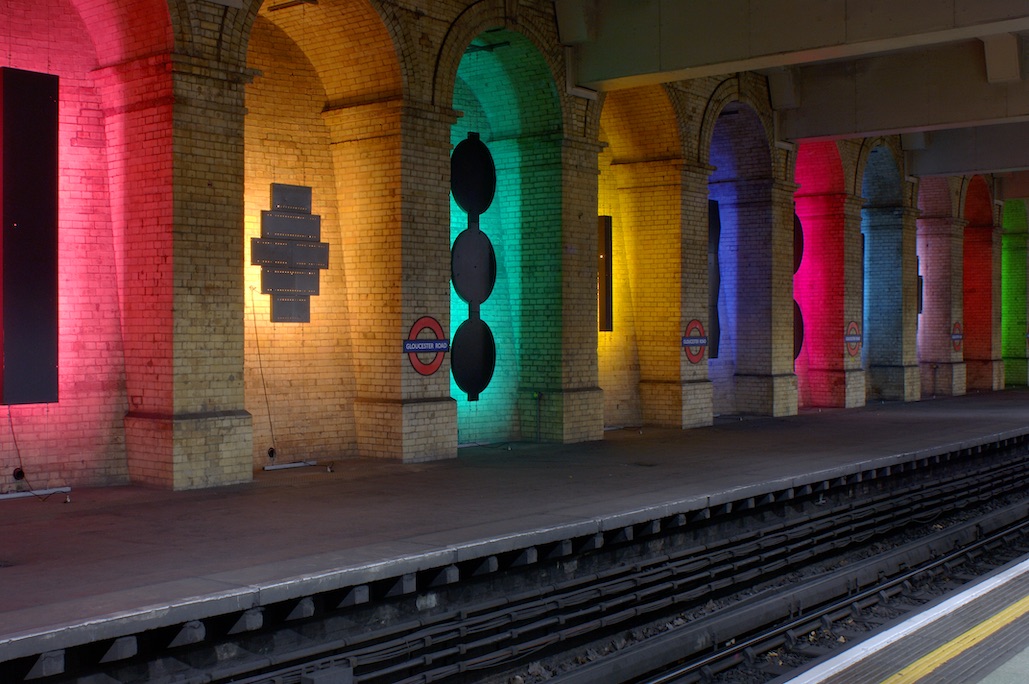 This collection of works by David Batchelor was made especially for presentation at Gloucester Road Underground station. Ten of the nineteen arched niches on the disused platform of the station housed a single work made of found steel or aluminium, centrally suspended and illuminated from behind. These dark silhouettes, of varying sizes and shapes, were surrounded by a halo of colour that filled each alcove. Exploiting the peculiarities of the arches and the space on the platform, the works combined darkness and brightness in a way that recalled the experience of travelling the Underground network or of moving about elsewhere in the city of London.