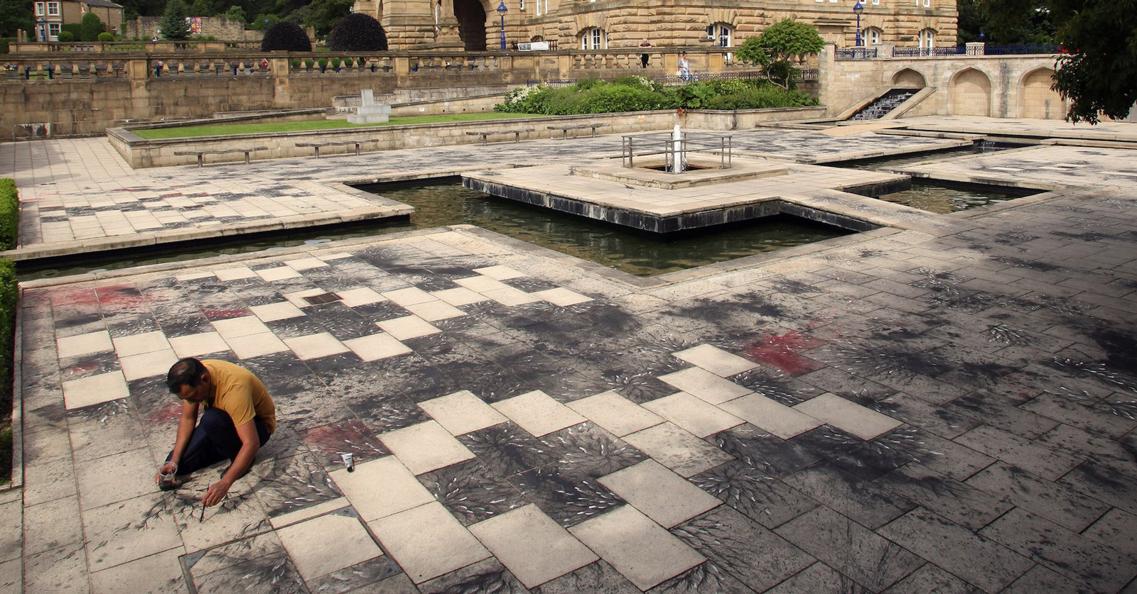Garden within a Garden was a two-part work situated in the Mughal Water Gardens in Lister Park, next to Cartwright Hall Art Gallery and in City Park, Bradford City Centre. The garden is a place of peace, tranquillity and safety. The works were painted directly on to the paving by the Pakistani artist Imran Qureshi. But this garden within a garden did not provide refuge from conflict, or a haven from the outside world. Instead, inspired by the history of the million-strong British Indian army that fought in the First World War, Qureshi transformed a public space into zones in which light and dark mix, horror and hope collide.